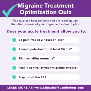 It is surprising how many patients leave their doctor’s office with a prescription without knowing realistically what they can expect from the acute treatment they’ve been given. The other side of that knowledge, of course, is knowing when a medication is NOT working appropriately. Medicines need to be re-evaluated in dose, combination with other treatments, or replaced. Migraine treatment goals should ideally focus on the mTOQ-4 questionnaire, which was created by Richard B. Lipton, MD, Director of the Montefiore Headache Center in New York. This is a validated, self-administered questionnaire that assesses the efficacy of current acute treatment. It asks the following 4 questions with the answer options each time being: Never or Rarely, Less Than Half the Time, Half the Time, or Greater.